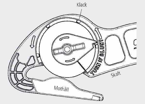 Fatta tag i centrumskruven och vrid motsols tills det hörs ett knäpp, eller tills du känner att du passerar en klack. När bladet roterats och slitits varvet runt är verktyget förbrukat och lämnas till din återvinningsstation.